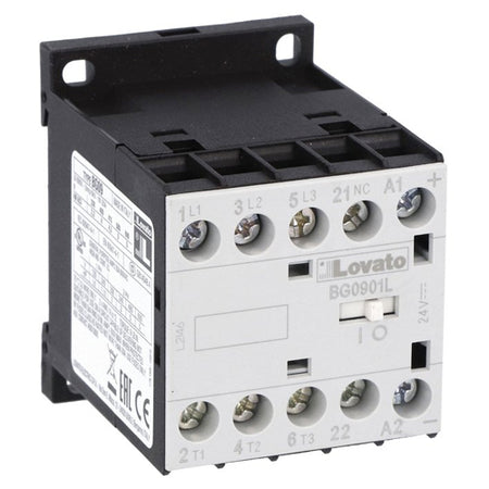 Lovato 11BG0901L024, Three-Pole BG Series Mini Contactor, IEC Operating Current Ie (AC3) = 9A, DC Coil Low Consumption, 24VDC, 1NC Auxiliary Contact
