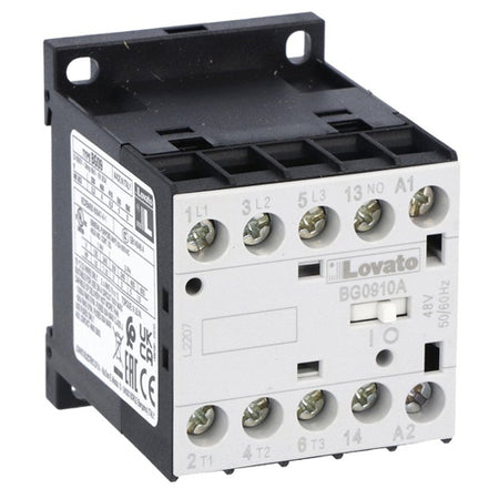 Lovato 11BG0910A46060, Three-Pole BG Series Mini Contactor, IEC Operating Current Ie (AC3) = 9A, AC Coil 60Hz, 460VAC, 1NO Auxiliary Contact