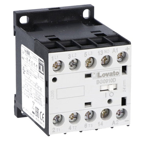 Lovato 11BG0910D024, Three-Pole BG Series Mini Contactor, IEC Operating Current Ie (AC3) = 9A, DC Coil, 24VDC, 1NO Auxiliary Contact