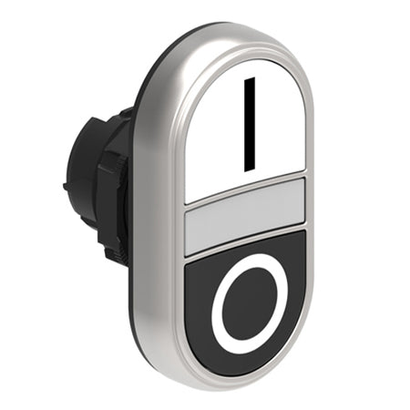Lovato LPCBL7124, Double-Touch Actuator with "I-O" Symbol, White Indicator, Ø22mm Platinum Series Chromed Plastic, Two Flush Pushbuttons, Both Spring Return, White/Black