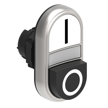 Lovato LPCBL7224, Double-Touch Actuator with "I-O" Symbol, White Indicator, Ø22mm Platinum Series Chromed Plastic, One Extended and One Flush Pushbuttons, Both Spring Return, White/Black