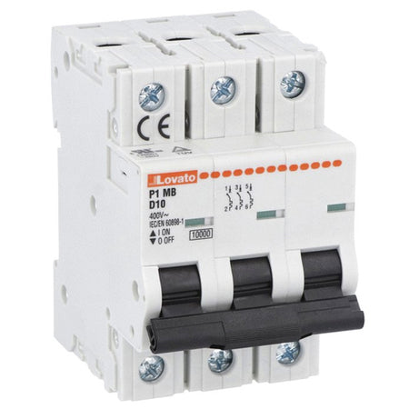 Lovato P1MB3PD06, Miniature Circuit Breaker, Thermal and Magnetic Trip Type, Three Pole (3P), 10kA, 3 Modules, D-Curve Characteristic, 6A