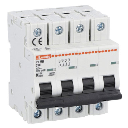 Lovato P1MB4PC50, Miniature Circuit Breaker, Thermal and Magnetic Trip Type, Four Pole (4P), 10kA, 4 Modules, C-Curve Characteristic, 50A