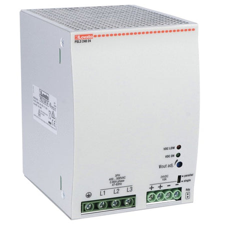 Lovato PSL324024, Din Rail Mount Switching Power Supplies with Maximum Functionality PSL Series, Three-Phase, Rated Output Voltage 24VDC, Rated Output Current 10A, Output Power 240W