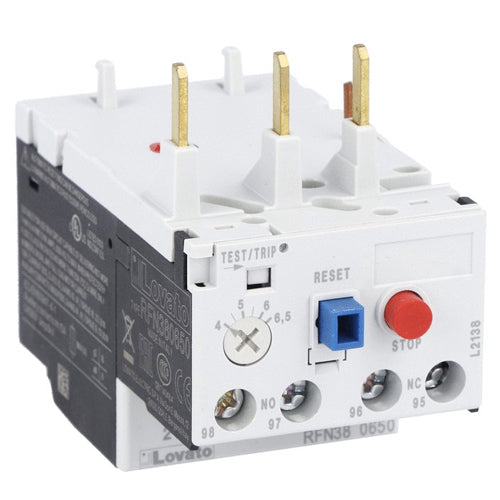 Lovato RFN380160, Thermal Overload Relay, Non Phase Failure/Non Single Phase Sensitive, Three Poles (Three Phase), Manual or Automatic Resetting, Direct Mounting on BF09-BF38 Contactors, Adjustment Range 1...1.6A