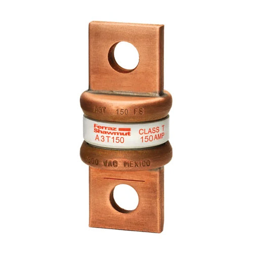 Fast-acting A3T Class T fuses combine two highly desirable features - high current-limitation and a small physical size. Their unique dimensions prevent the substitution of other fuses with lower voltage ratings or current-limiting capability. These fuses have glass melamine bodies for superior dimensional stability and catalog numbers stamped into the blades for permanent identification.