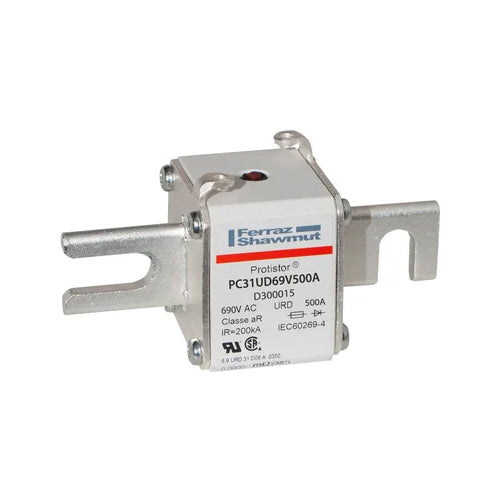 Mersen D300015, Square Body High-Speed Fuse, Fast Acting, Size 31 aR, 690/700VAC, 500A, With Striker DIN 80 Blades