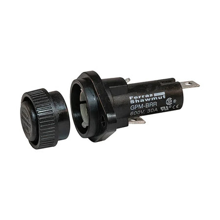 Mersen GPM-BRR, GPM Series 30A Panel Mount Fuse Holder Class CC, 600VAC/DC, 1-Pole, 1/4” Quick-connect/Solder Terminal, 1/4 Turn Bayonet Knob