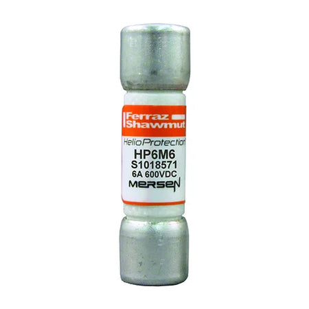 Mersen HP6M photovoltaic (PV) fuse series was engineered and designed specifically for the protection of photovoltaic systems. Its enhanced fuse construction makes it ideal for constant temperature and current cycling withstand adding to system longevity. The 600VDC rated HP6M, designed for low minimum breaking capacity capabilities of 1.35 times the fuse rated current value, allows for safe circuit interruption under typical low fault current conditions produced by PV arrays. Protect your off-grid or grid tied PV system from unexpected ground faults and line faults using Mersen's HelioProtection fuse line