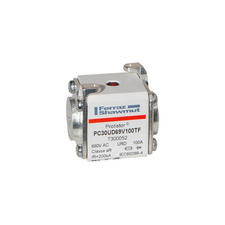 Mersen T300052, Square Body High-Speed Fuse, Fast Acting, Size 30 aR, 690/700VAC, 100A, With Striker Flush ends metric threads