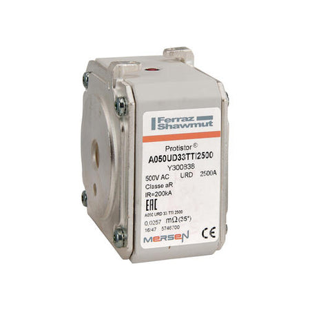 Mersen Y300838, Square Body High-Speed Fuse, Fast Acting, Size 33 aR, 450/500VAC, 2500A, With Striker Flush ends UNC threads