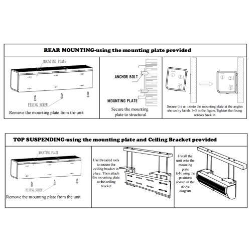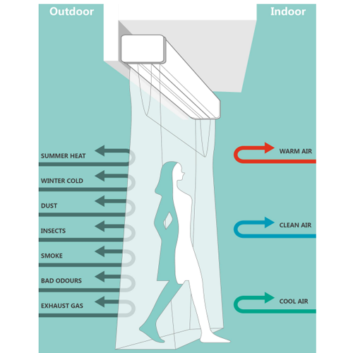 | Notes | The air curtains are always shipped completely assembled, and consist of wall mounting plate, power units, air filter, and hand hold remote controller. |