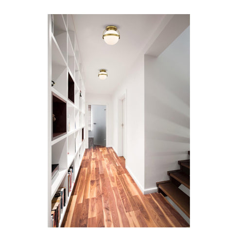 Satco 60-7781, Lakeshore, 1-Light Medium Flush Mount Ceiling Light Fixture, 120V, 60W, Natural Brass Finish, White Opal Glass