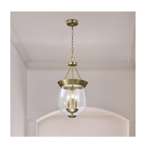 Satco 60-7801, Boliver, 3-Light 11" Pendant Ceiling Light Fixture, 120V, 60W, Candelabra Base, Vintage Brass Finish, Clear Seeded Glass