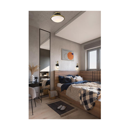 Satco 60-7905, Lafayette, 1-Light 14" Flush Mount Ceiling Light Fixture, 120V, 60W, Medium Base, Matte Black Finish with Natural Brass Accents and White Opal Glass