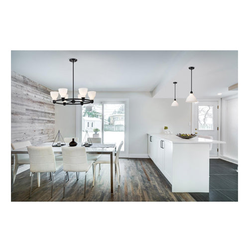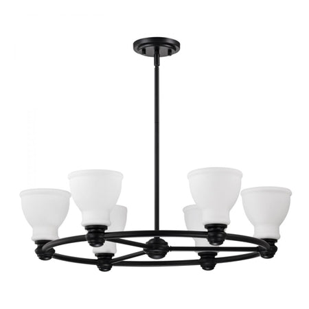 Satco 60-8027, Russel, 6-Light Chandelier, 120V, 60W, Medium Base, Matte Black with Satin White Glass