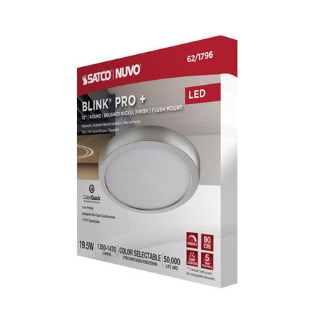 Satco 62-1796, Blink Pro Plus, 12'' LED Surface Mount Fixture, Round, 120/277V, 19.5W, CCT Selectable 2700/3000/3500/4000/5000K, 1350-1470 Lumens, Brushed Nickel Finish