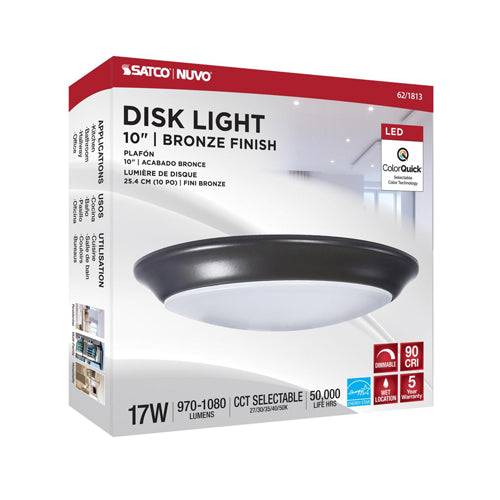 Satco 62-1813, 10" LED Disk Light, 120V, 17W, 5-CCT Selectable 2700/3000/3500/4000/5000K, 970-1080 Lumens, Bronze Finish