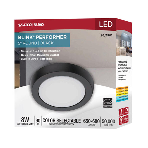 Satco 62-1901, Blink Performer, 5" LED Round Flush Mount Fixture, 120V, 8W, 5 CCT Selectable, 650-680 Lumens, Black Finish
