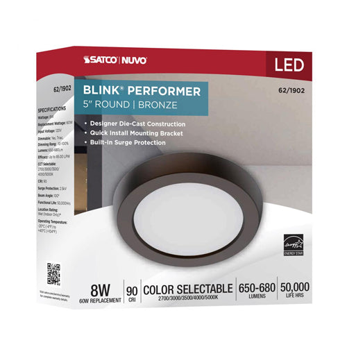 Satco 62-1902, Blink Performer, 5" LED Round Flush Mount Fixture, 120V, 8W, 650-680 Lumens, 5 CCT Selectable, Bronze Finish