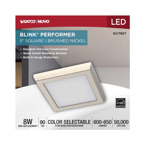 Satco 62-1907, Blink Performer, 5" LED Square Flush Mount Fixture, 120V, 8W, 600-650 Lumens, 5 CCT Selectable, Brushed Nickel Finish