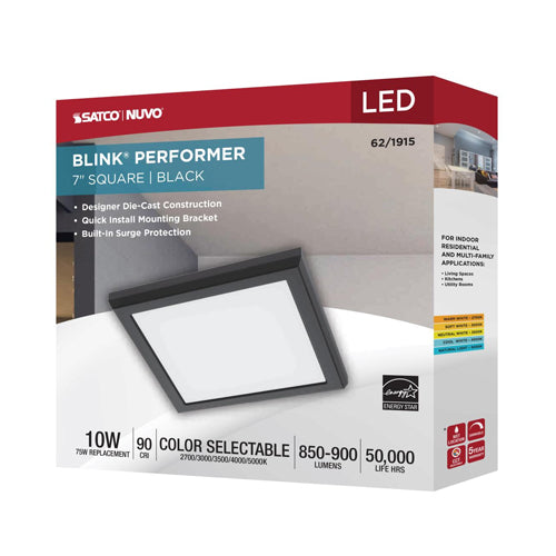 Satco 62-1915, Blink Performer, 7" LED Square Flush Mount Fixture, 120V, 10W, 850-900 Lumens, 5 CCT Selectable, Black Finish