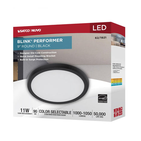 Satco 62-1921, Blink Performer, 9" LED Round Flush Mount Fixture, 120V, 11W, 1000-1050 Lumens, 5 CCT Selectable, Black Finish