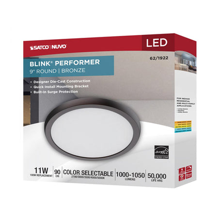 Satco 62-1922, Blink Performer, 9" LED Round Flush Mount Fixture, 120V, 11W, 1000-1050 Lumens, 5 CCT Selectable, Bronze Finish