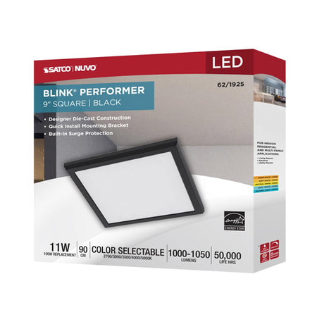 Satco 62-1925, Blink Performer, 9" LED Square Flush Mount Fixture, 120V, 11W, 1000-1050 Lumens, 5 CCT Selectable, Black Finish