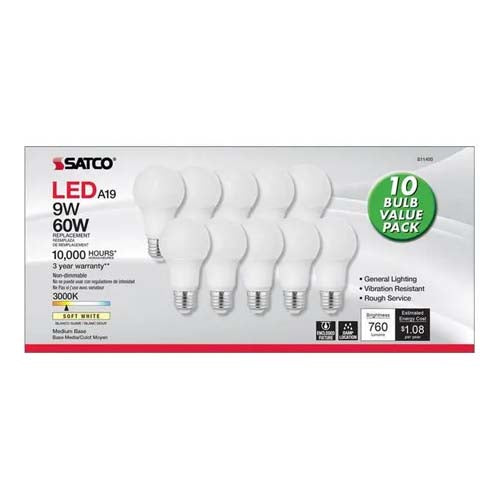Satco S11400, A19 LED, 9W, 120V, 3000K Soft White, 760 Lumens, Medium E26 Base, Frost Finish