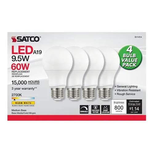 Satco S11414, A19 LED, 9.5W, 120V, 2700K Warm White, 800 Lumens, Medium E26 Base, Frost Finish