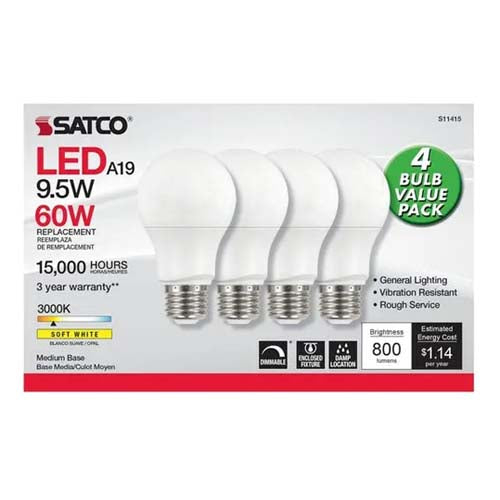 Satco S11415, A19 LED, 9.5W, 120V, 3000K Soft White, 800 Lumens, Medium E26 Base, Frost Finish