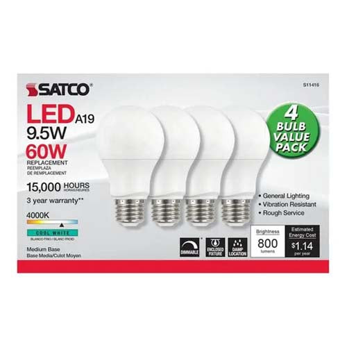 Satco S11416, A19 LED, 9.5W, 120V, 4000K Cool White, 800 Lumens, Medium E26 Base, Frost Finish