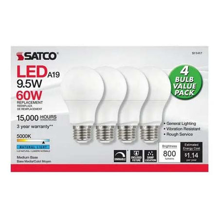 Satco S11417, A19 LED, 9.5W, 120V, 5000K Natural Light, 800 Lumens, Medium E26 Base, Frost Finish