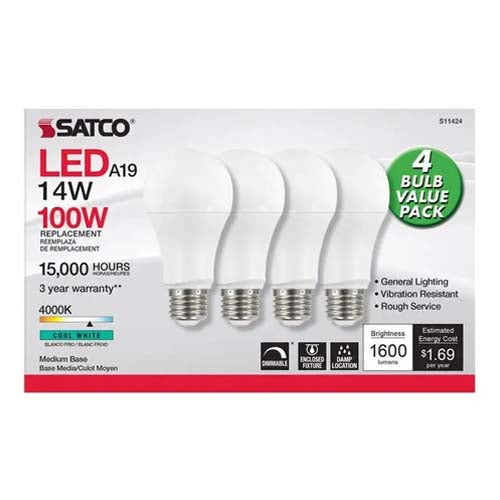 Satco S11424, A19 LED, 14W, 120V, 4000K Cool White, 1600 Lumens, Medium E26 Base, Frost Finish