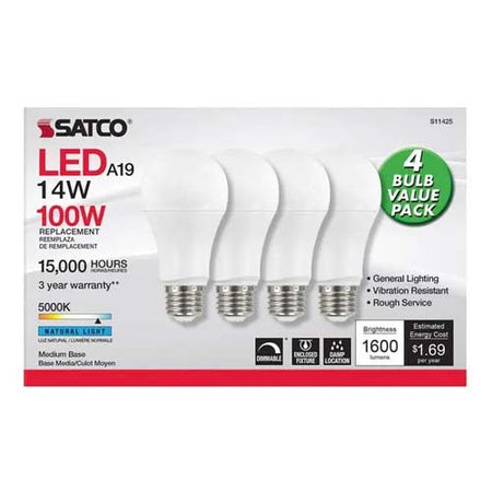 Satco S11425, A19 LED, 14W, 120V, 5000K Natural Light, 1600 Lumens, Medium E26 Base, Frost Finish