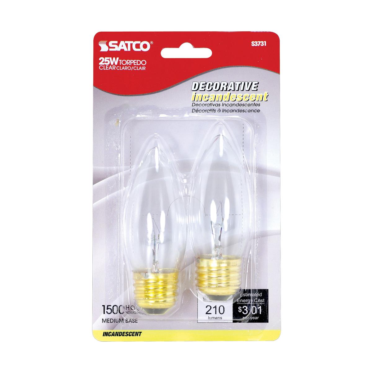 Satco S3731, B11 Incandescent, 25W, 120V, 2700K Warm White, 210 Lumens, Medium E26 Base, Clear Finish, 10 Packs