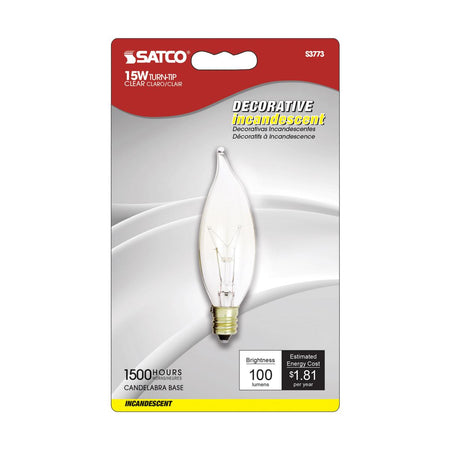 Satco S3773, CA8 Incandescent, 15W, 120V, 2700K Warm White, 100 Lumens, Candelabra E12 Base, Clear Finish, 10 Packs