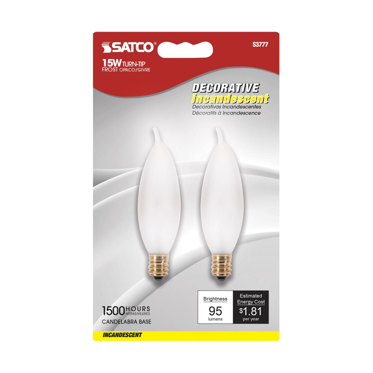 Satco S3777, CA8 Incandescent, 15W, 120V, 2700K Warm White, 95 Lumens, Candelabra E12 Base, Frost Finish, 10 Packs