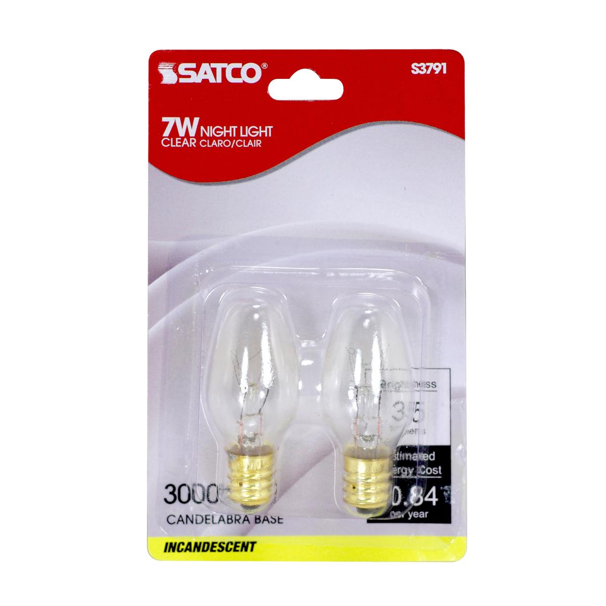 Satco S3791, C7 Incandescent, 7W, 120V, 2700K Warm White, 35 Lumens, Candelabra E12 Base, Clear Finish, 20 Packs