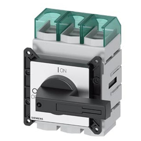 SENTRON 3LD5 switch disconnector UL, main switch, 3-pole, approved according to UL 489, UL 60947-4-1 and IEC 60947-3, UL: 100 A, SCCR 65 kA at 480 V AC, operational power @ 480 V AC 3-phase: 60 hp, IEC: 100 A, operational power at AC-23 A at 400 V: 45 kW, front-mounted: rotary operating mechanism, black, 4-hole mounting of the handle, including terminal covers for the infeed side infeed side
